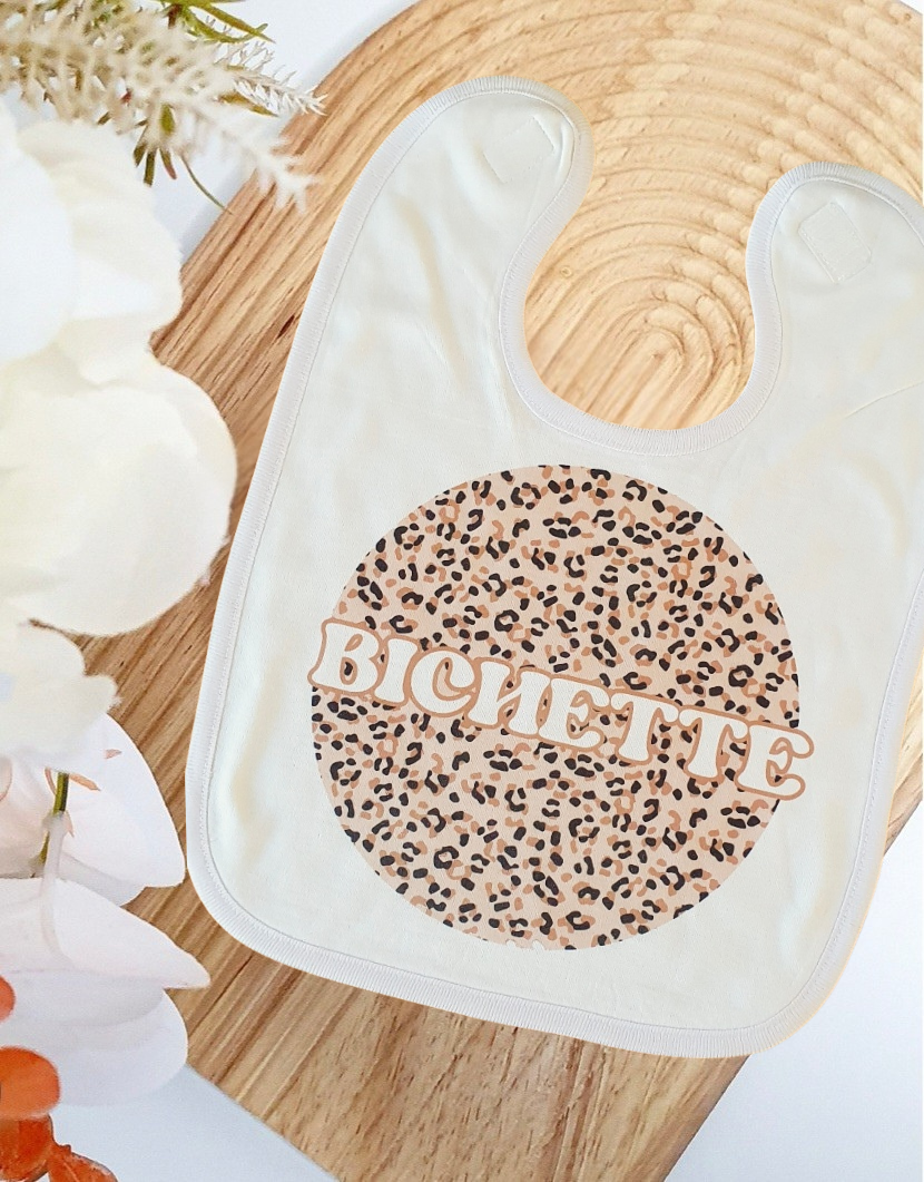Grand bavoir sublimé Bichette, 100% polyester avec un arrière en tissus éponge.