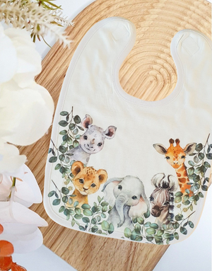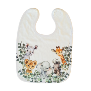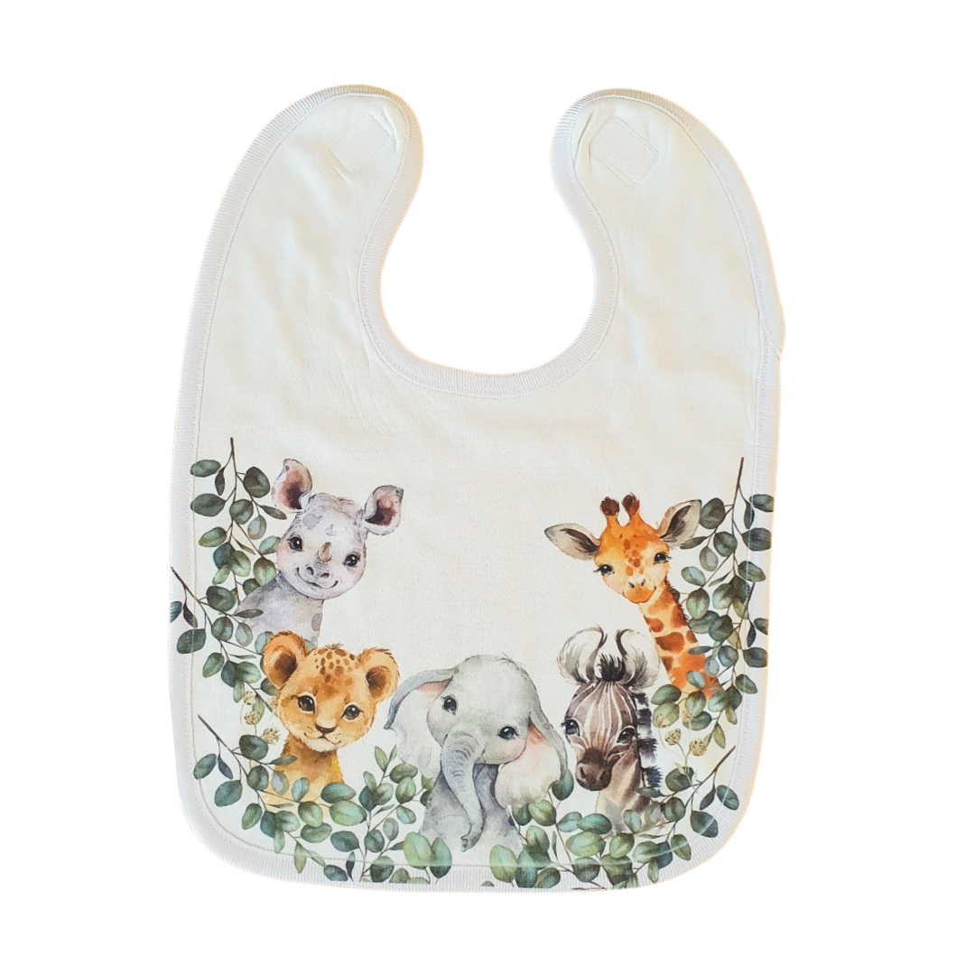 Grand bavoir sublimé Jungle, 100% polyester avec un arrière en tissus éponge.