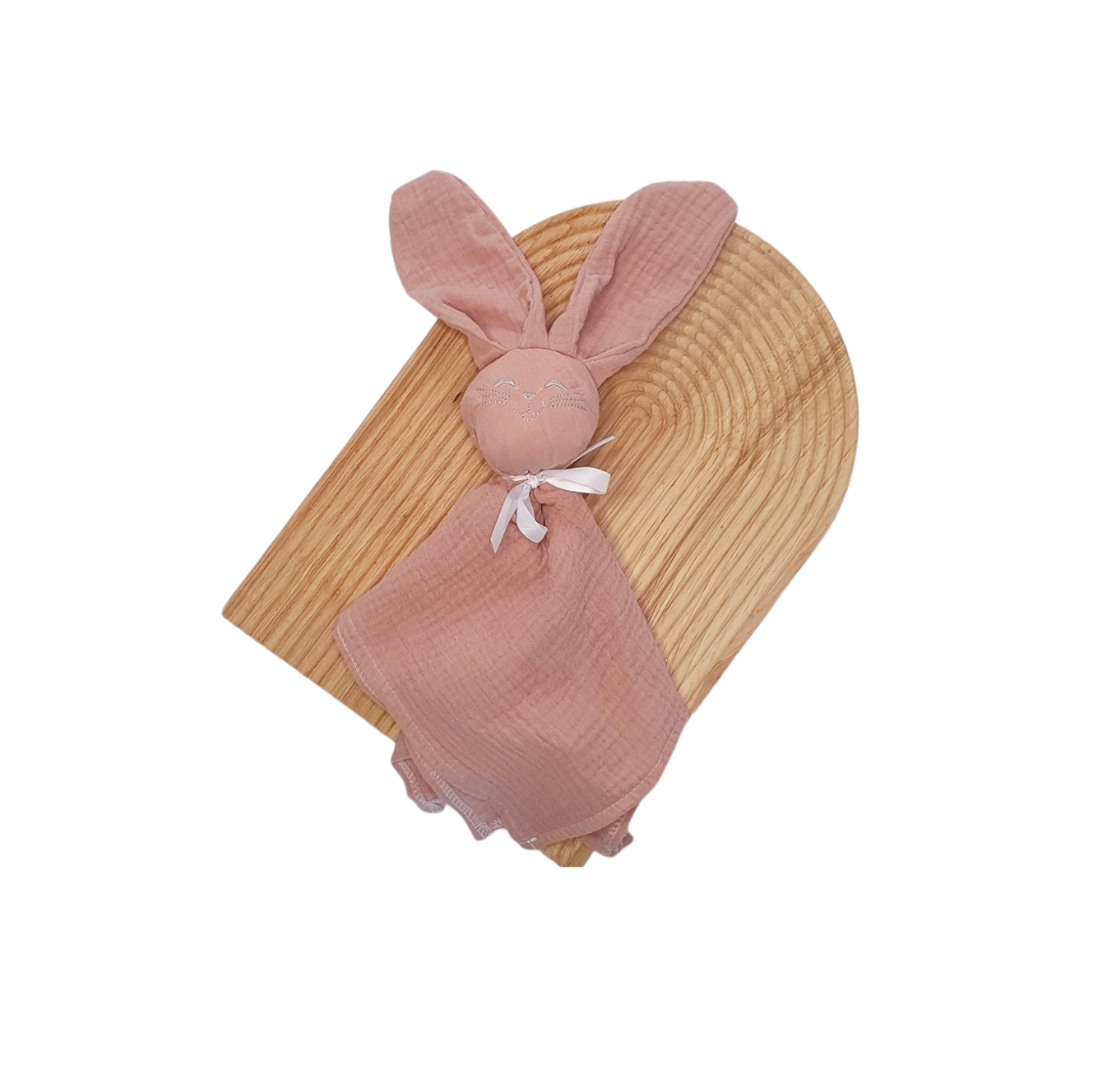 Adorable doudou lapin 100% personnalisable en gaze de coton.